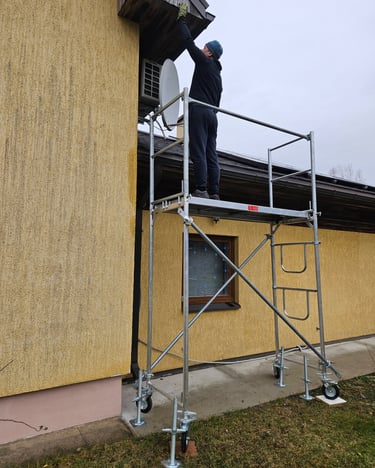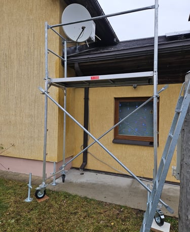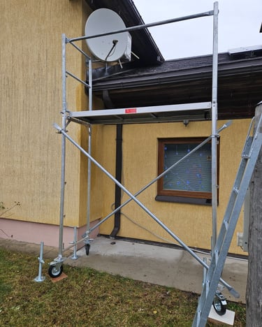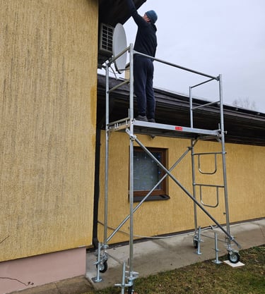 Stabils, drošs un labi nokomplektēts. Apdares darbus iespējams veikt līdz 4.7m augstumam. Var nokomplektēt vēl garāku un vēl augstāku. Iespējams strādāt arī iekšdarbos.